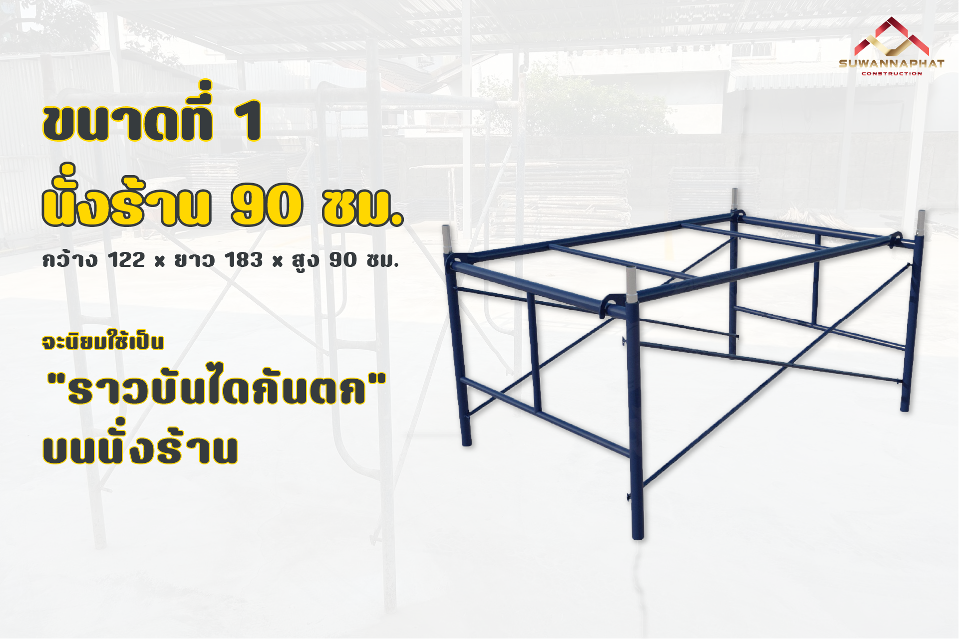 - นั่งร้าน 90 ซม. (มีขนาด กว้าง 122 ซม. x ยาว 183 ซม. x สูง 90 ซม.) นิยมใช้เป็นราวบันไดบนนั่งร้าน