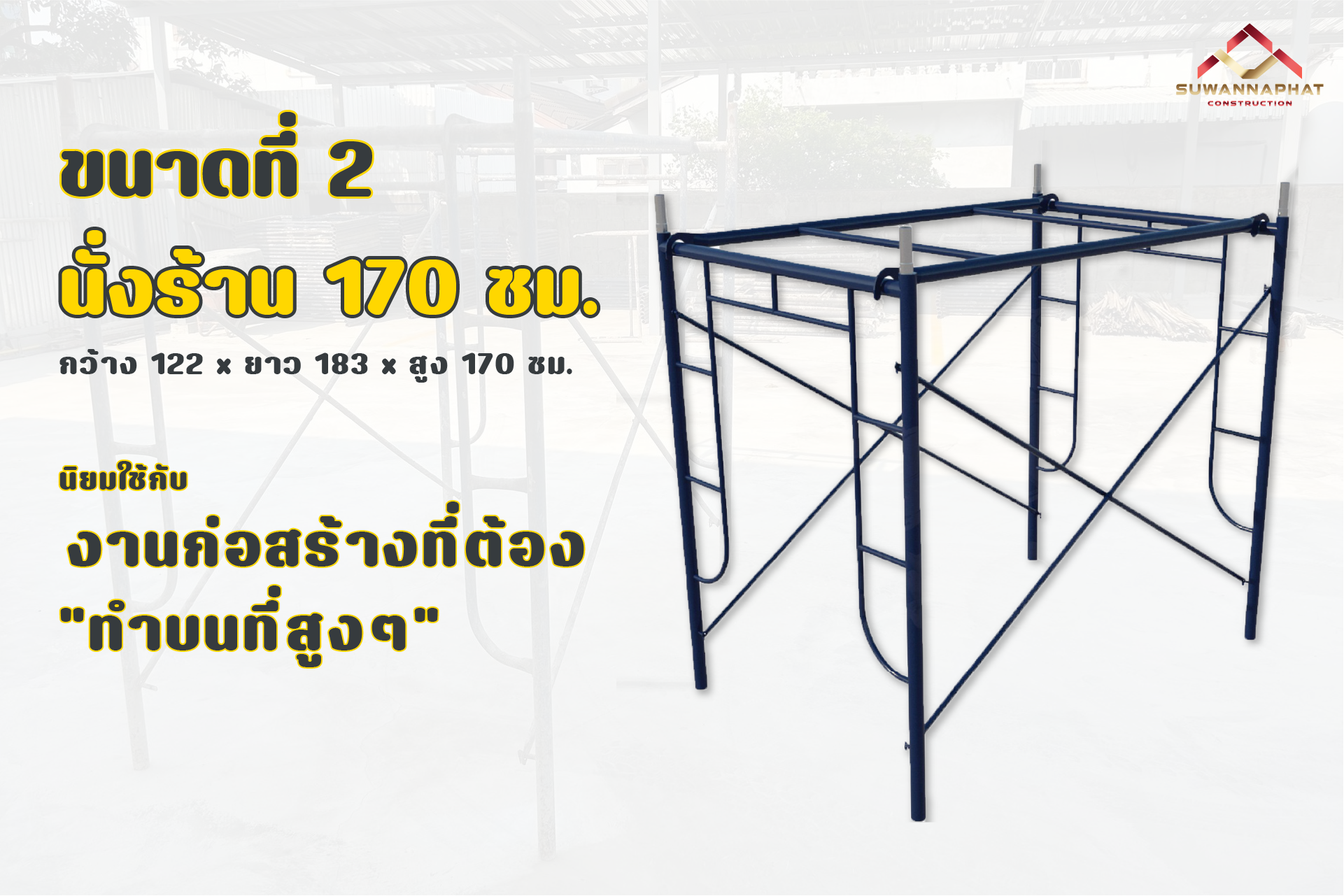 - นั่งร้าน 170 ซม. (มีขนาด กว้าง 122 ซม. x ยาว 183 ซม. x สูง 170 ซม.) นิยมใช้ในงานก่อสร้างบ้าน และอาคารทั่วๆ ไป ที่ต้องขึ้นไปทำงานในที่สูงๆ
