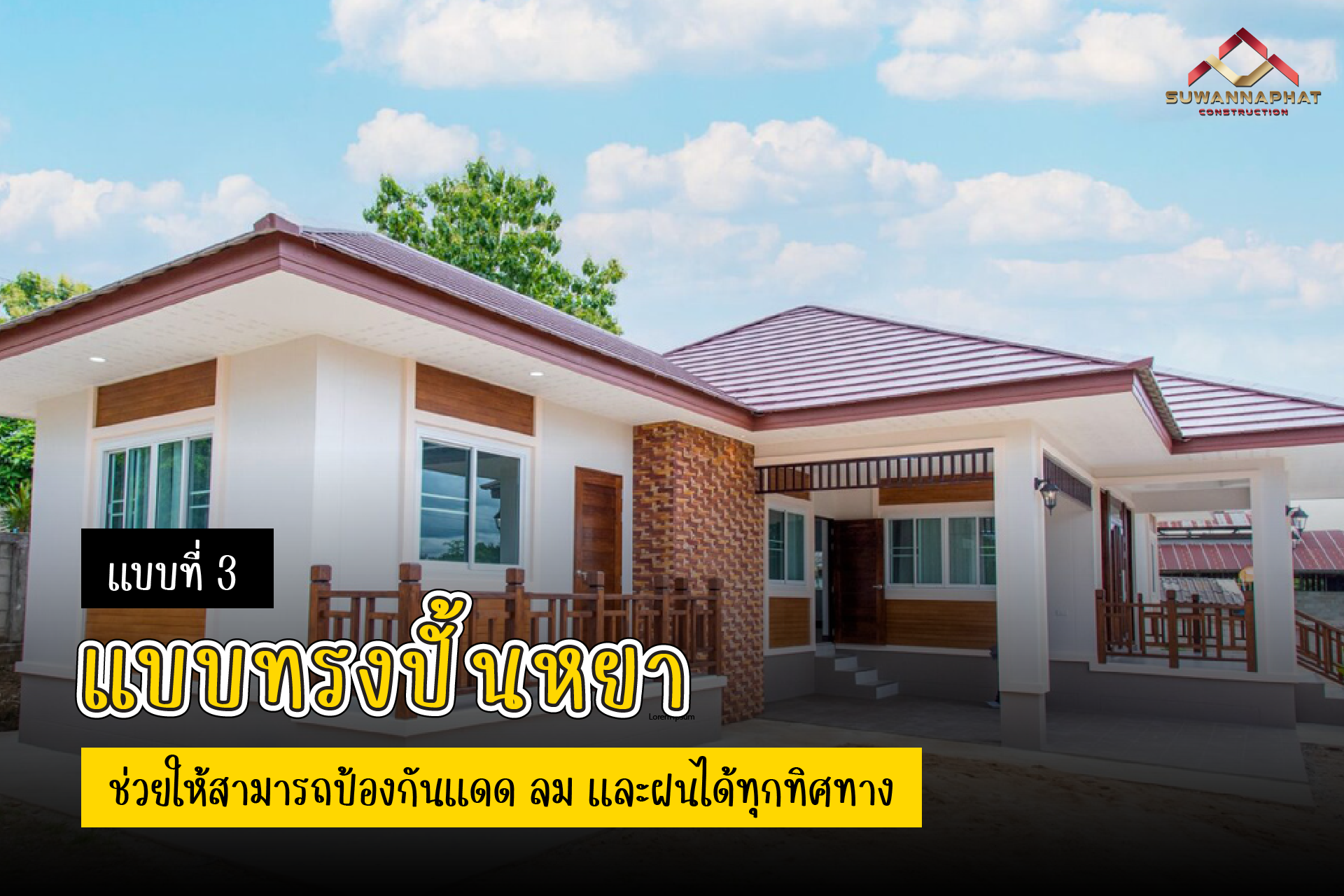 - จุดเด่น : ก่อสร้างง่าย มีพื้นที่ใต้หลังคามาก ช่วยระบายอากาศได้ดี ทำให้บ้านเย็นสบาย